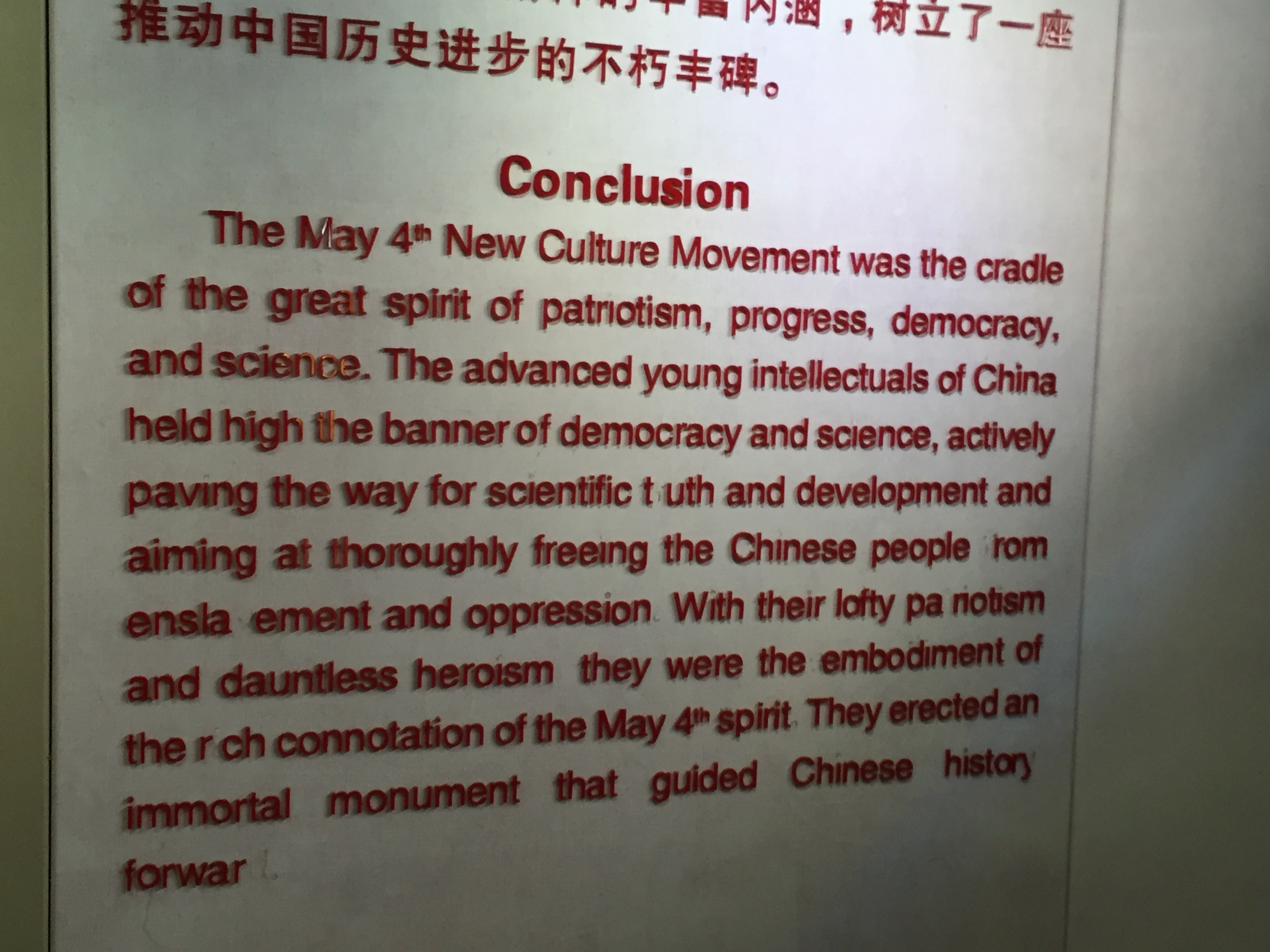 The above panel was one I saw at the Red Building in March 2016, almost 10 years ago. This panel states: “The May 4th New Culture Movement was the cradle of the great spirit of patriotism, progress, democracy and science. The advanced young intellectuals of China held high the banner of democracy and science, actively paving the way for scientific truth and development and aiming at thoroughly freeing the Chinese people from enslavement and oppression”. That is a rather different emphasis from what I saw in the introductory panel to the current exhibition in November 2025.